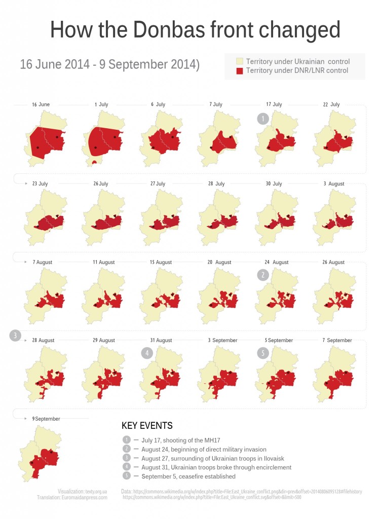 1. The ongoing limited war with soldiers being killed almost every day is terrible. However, it could be much worse. In the end of May 2014, when the vote in Ukrainian presidential elections was ongoing, Russia-backed separatists had nearly taken the entire Donetsk and Luhansk oblasts under control with the active support of Russian weapons and paramilitaries. In July and August, Ukrainian armed forces started an offensive operation to close the border with Russia and round up separatist troops. They had almost succeeded when Russian armed forces openly interfered and finally led to the current situation of frozen conflict. Nonetheless, due to this brave offensive, not entire Donbas is occupied.
