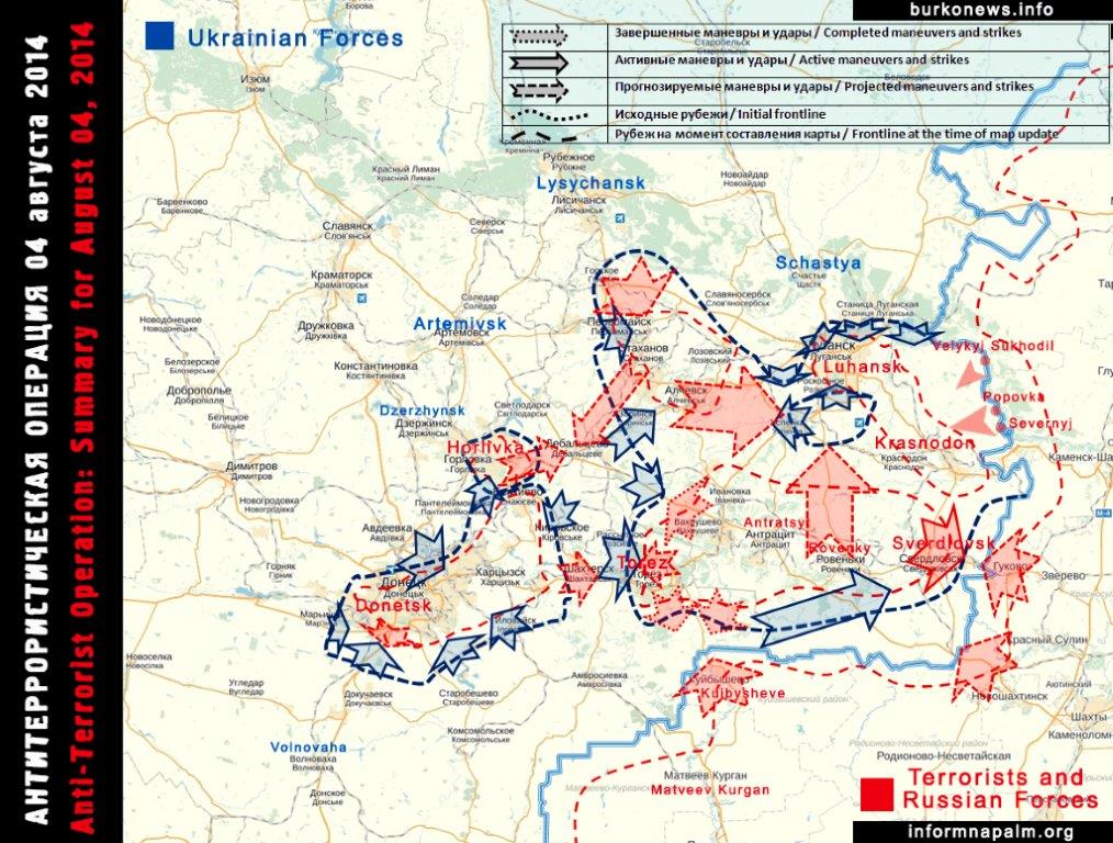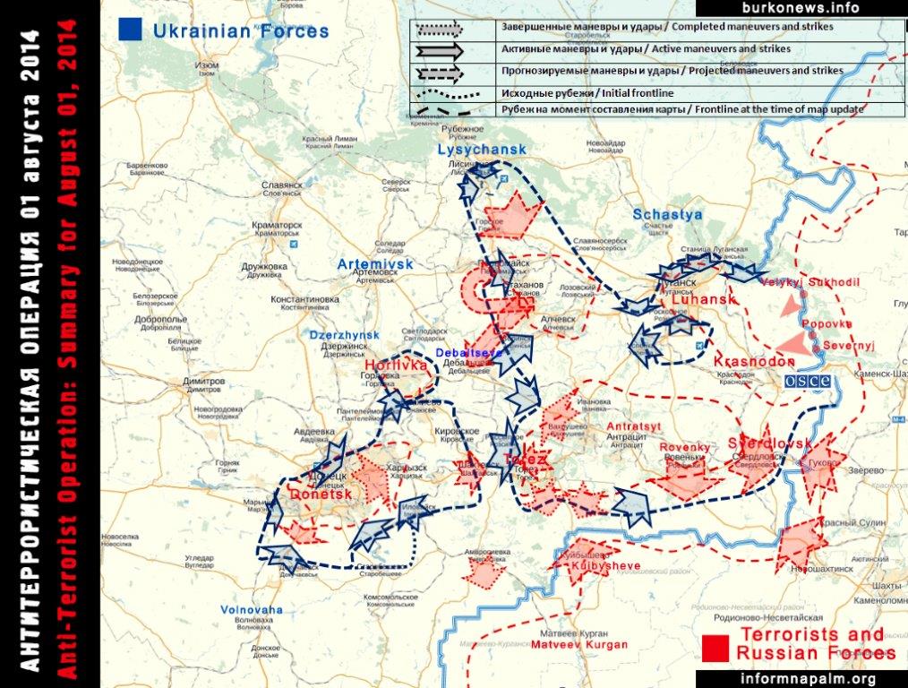 Die russischen Versuche, den IAF-Terroristen dadurch zu helfen, daß die ukrainische Armee von russischem Territorium aus mit Granaten beschossen wurde, mißlang. Die IAF-Terroristen in Donezk wurden sowohl von den Terroristen in Luhansk als auch von der Versorgung aus Russland abgeschnitten. Der Ring wird weiterhin enger gezogen, zuletzt mit der Befreiung zweier weiterer Städte, Krasnohorivka und Staromichailivka am 2. August 2014.