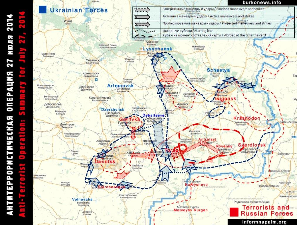 Einige ukrainische und ausländische Medien verbreiten die Information, daß der Generalstab der Ukraine nichts tun würde, um den im Izvarinsker Bogen (Izvarinsky pocket) eingeschlossenen Einheiten zu helfen. Solche Veröffentlichungen sind ein typisches Beispiel für die unberechtigte Panik und die Inkompetenz solcher Lehnsessel-Militärexperten, wie sie von den Medien zitiert werden. Sowas passiert, weil den Medien jedes Verständnis, selbst für die elementaren Prinzipien moderner Militärstrategie fehlt. Viele Veröffentlichungen haben diskutiert, daß die Kräfte der Anti-Terror-Operation (ATO) die „strategische Initiative verloren“ hätten, und daß die illegalen bewaffeneten Formationen (IAF) sie während des Ausbruchs der Girkin’schen Terrorgruppe aus Slawiansk Richtung Donezk gewonnen hätten.