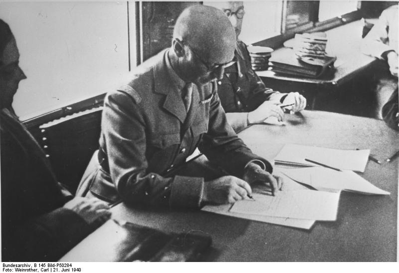 Jetzt wurde eine Marionettenregierung mit Marschall Pétain an der Spitze gebildet. Am 23. Juni 1940 zog Hitler im Triumph im geschlagenen Paris ein. Am 1. Juli zog das Marionettenregime unter Marschall Pétain nach Vichy. Am 10. Juni begann die deutsche Luftwaffe die Luftschlacht um England. Dies war der hohe Preis, den Europa zahlen mussten – für seine Unwilligkeit, Hitlers Aggression zu widerstehen, als er die Rote Linie überschritt.