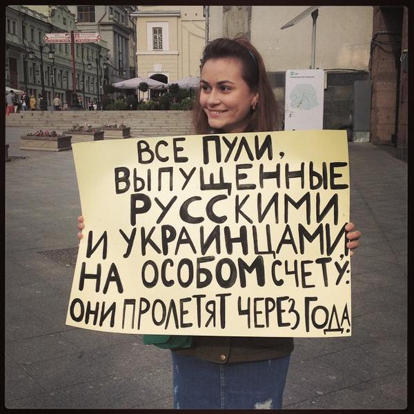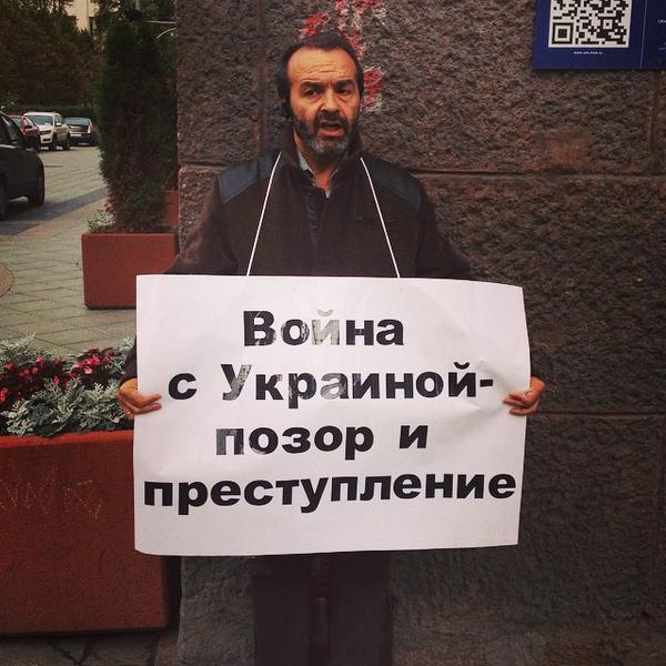 According to the website of Russian internet and satellite broadcaster Dozhd TV, writer and journalists Viktor Shenderovich took part in the picket on Tverskaya Street, holding a poster "War against Ukraine is a disgrace and a crime". According to the same report, musician Vasya Oblomov staged his own picket outside the State Historical Museum near Red Square in Moscow. His poster read in English "Make love not Novorossiya". Novorossiya is a separatist-controlled area in southeast Ukraine.
