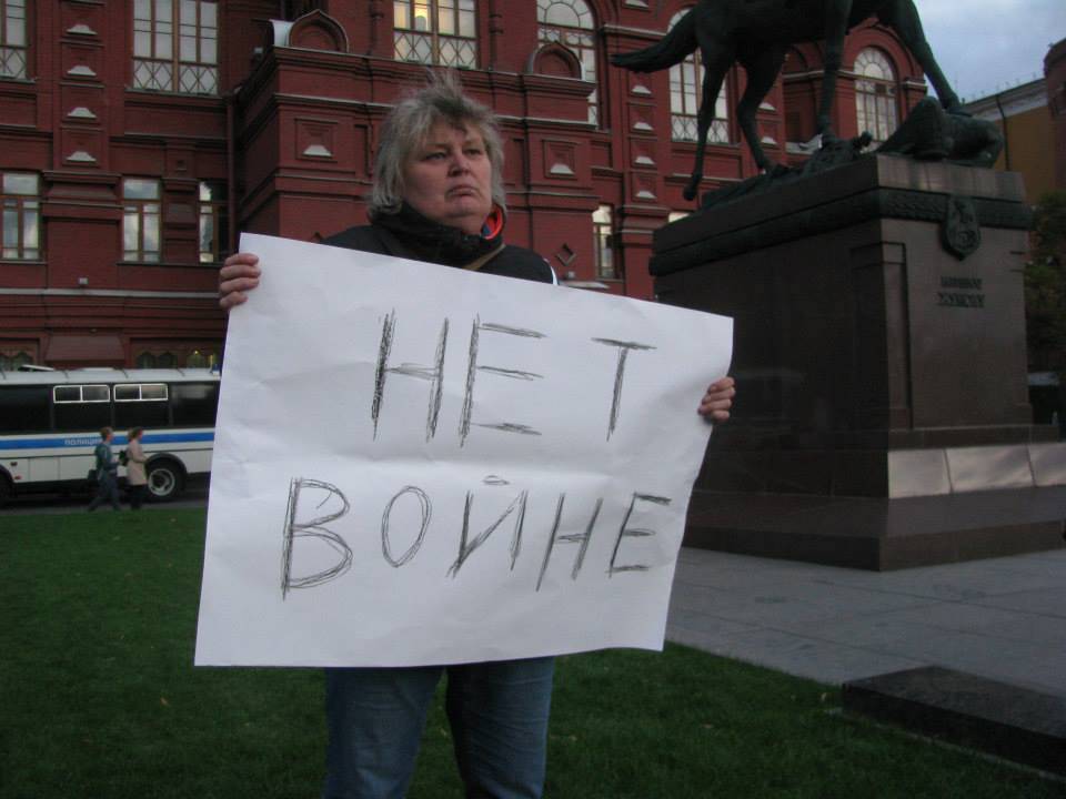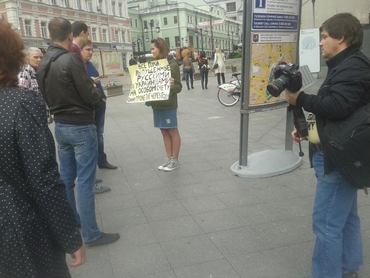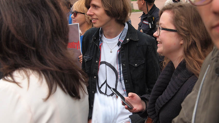 Later that same day, Russian musician Bob Oblomov stood in front of the State Historical Museum with a poster “Make love not Novorossia”.
