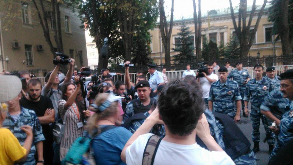 - Die Moskauer Polizei nimmt Dutzende fest, die am 12. August 2014 außerhalb der ukrainischen Botschaft stehen.
