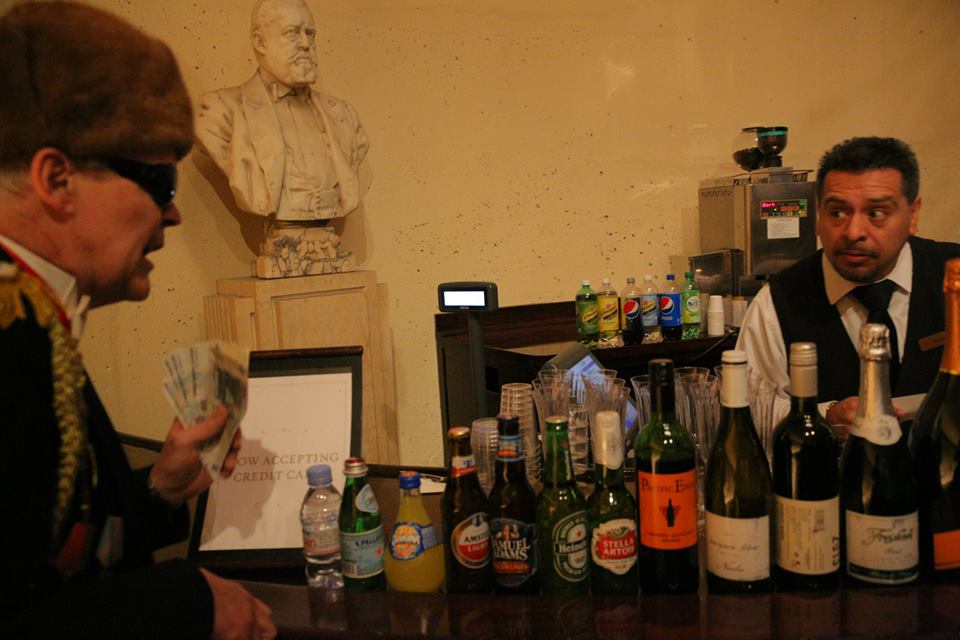 Once inside the Met, there was ample opportunity for both impersonators to display their "personas" to opera fans. Our Netrebko clone portrayed an addle-headed soprano proud of her support for terrorists and wearing her famous "On to Berlin!" sash. Our Tsarov clone (in white socks and tuxedo bristling with third world dictator medals) promenaded during the intermission and handed out free rubles to fellow audience members.