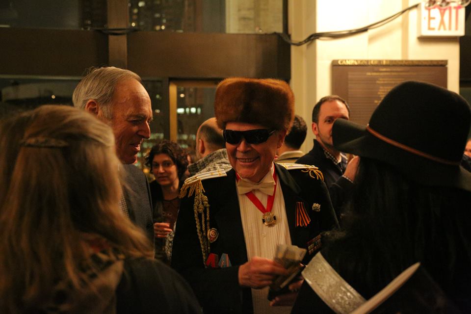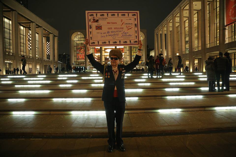 On January 29, 2015 the group “Arts Against Aggression” created an event featuring two New York activists, Liudmila Joy-Vasuta and Adrian Bryttan. As Met Opera audience members, they dressed up in costume to parody soprano Anna Netrebko and the terrorist Oleg Tsarov (the Donetsk "leader" widely seen in photographs accepting one million rubles from Netrebko, while both held the "Novorossiya" flag for public consumption).