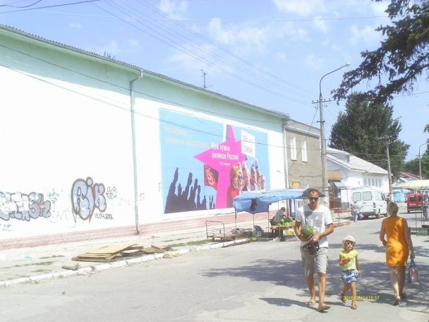 The incident was reported in the facebook post of a pro-Putin activist Maks Ovsiannikov, who has found out that the huge poster on display on the wall of a local children's after-school education facility called Pioneers Palace was agreed upon with the local administration. The texts read "They need great perturbations. We need a strong Russia!", which is a quote of Pyotr Stolypin, a monarchist politician whose tenure was marked by efforts to counter revolutionary groups, and "We are the power!"