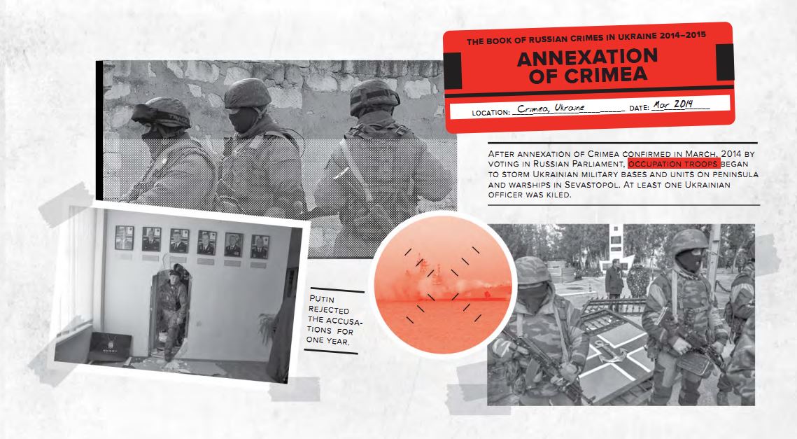 The book was created by Volodymyr Ariev, the head of Ukraine's delegation to PACE, together with the designer Dima Tsapko and Tough Slate Design. The 79-page report contains descriptions of the events around the annexation of Crimea, the shot down MH17 Malaysian Boeing, the artillery strike on Mariupol, Ilovaisk tragedy, torture in Donbas, persecution of Crimean Tatars, and other episodes of the war.