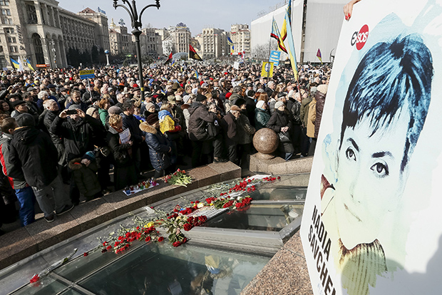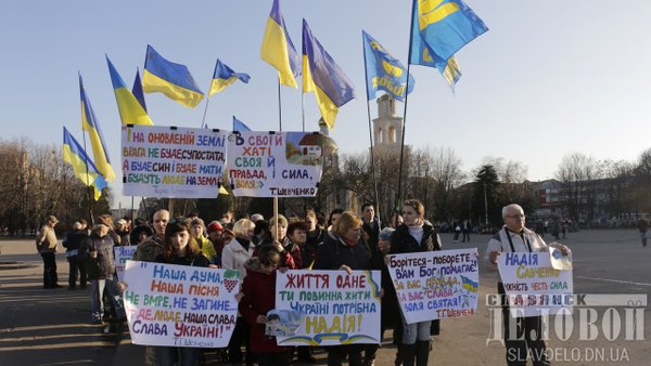 At the same rally, projectors decorated a building with signs "indifference kills" and "Free Savchenko."