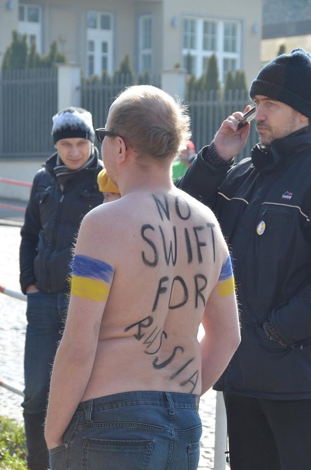 With "weapons for Ukraine" and "No SWIFT for Russia," they sent a doll with female breasts and a mask of Putin into the yard of the embassy, to be stopped by the police immediately afterwards. They carried signs demanding to free Ukrainian film director Oleg Sentsov, pilot Nadiya Savchenko, and Crimean Tatar leader Akhtem Chiygoz, who are unjustly imprisoned and prosecuted in Russia. They are but three of 25 Ukrainian political prisoners jailed in the Russian Federation.