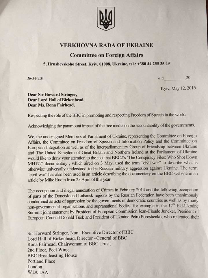 Deputy Zalishchuk explains that the letter is "our reaction to the May 3rd, 2016 broadcast of the documentary 'Who shot down MH17' on the British TV channel BBC-2. The film shows Russia's involvement in the disaster, yet the authors still resort to using Russian clichés about 'civil war' in Ukraine," says Zalishchuk.