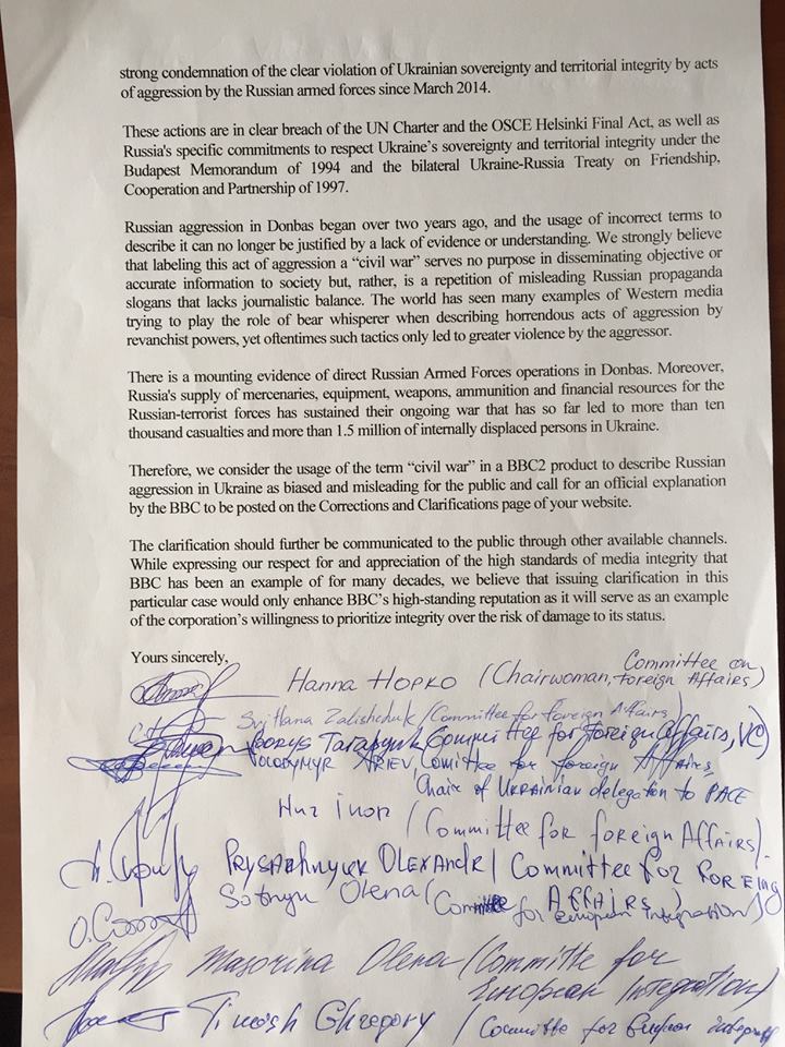 In the letter, the deputies state that the situation in Ukraine and Crimea is occupation and aggression by Russia, statements that are universally recognized by democratic nations as well as some non-democratic ones. Continuing to use the term "civil war" by the BBC, they state, is biased and therefore misleading the public. They urge the channel to discontinue using this term and publish an explanation for consumers on the BBC's Corrections and Clarifications Page.