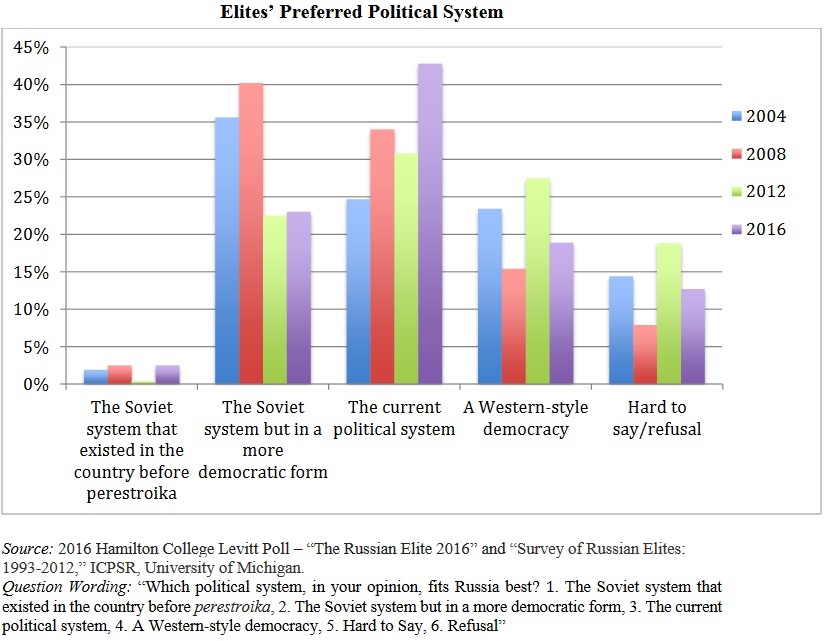 The Hamilton College survey this year also found that elites are “united around Vladimir Putin and do not see a chance for his replacement in the next ten years. Further, a sizeable share of them, more than in any of the earlier surveys this college has made, say that the current Russian political system is “the best.”