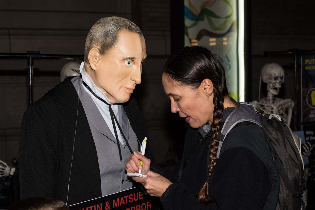 The protest featured a protester dressed as Russian President Vladimir Putin.