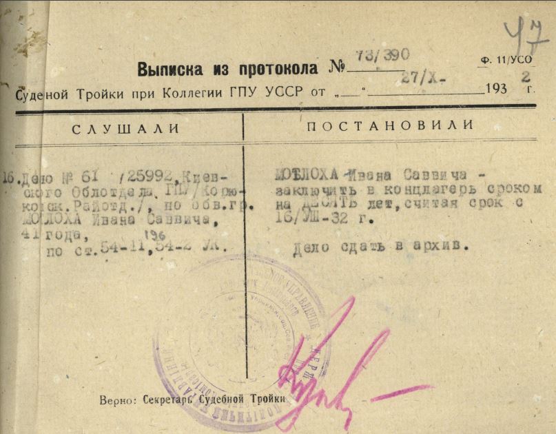One case hosted online is of Ivan Motlokh, a participant of the so-called counter-revolutionary movement resisting forced collectivization called "Free Kozaks," who was arrested on 17-18 August 1933 and sentenced to ten years in a concentration camp.