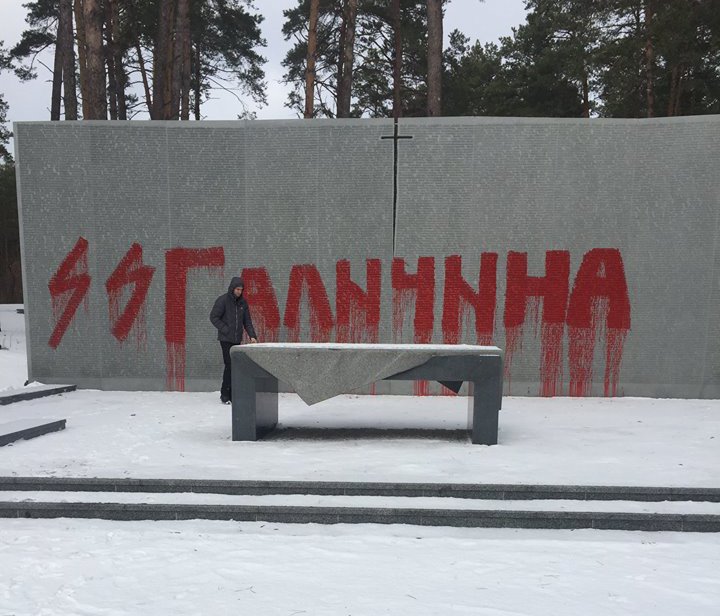 On 25 January 2017, graves of Polish officers at the Bykivnia cemetary in north-central Ukraine were vandalized with the words "OUN-UPA" and "SS-Galizien" being painted over the grave monuments in red, the last one referring to the Ukrainian division which collaborated with the Nazis and is accused by the Polish Institute of National remembrance for the ethnic cleansing of Poles in Huta Peniatske.