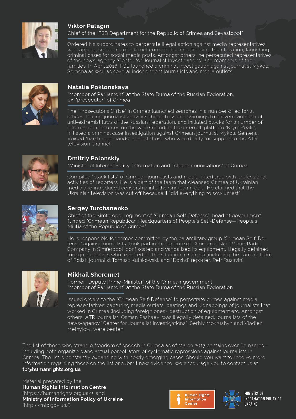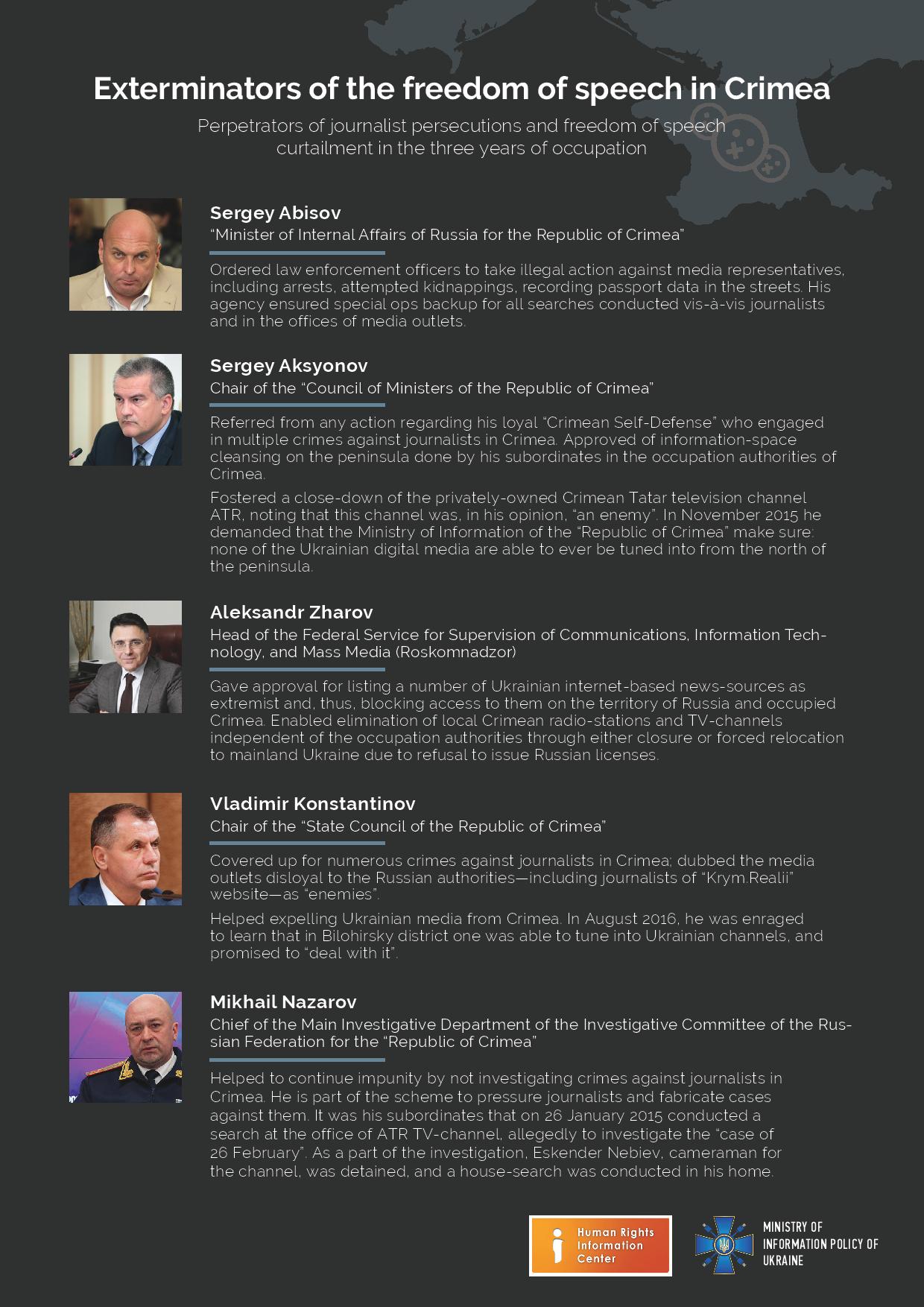 The Ministry of information policy of Ukraine together with the Human Rights Coordination Center has formed a list of people responsible for the violation of freedom of speech and journalists’ rights in Crimea, suggesting personal sanctions against these people. It includes over 60 people - Russian and Crimean officials, officers in law enforcement and specialized institutions, members of the “Crimean Self-Defence” who attacked media representatives, heads of the press centers who compiled blacklists of journalists as well as other actors who engaged in journalist persecutions and instigation of a propaganda war against Ukraine.