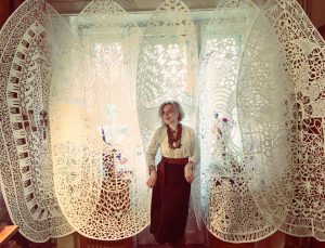 The art of cutting out intricate designs out of paper is practiced in Belarus (called "vyrazanka"), Poland ("wycinanki"), and Ukraine, but became especially widespread in the region of Vynnytsia Oblast, where Dariya was raised by artist parents. There, symposiums dedicated to the technique with which local villagers decorate their homes and windows are held, and several vytynanka museums gather the best traditional examples.
