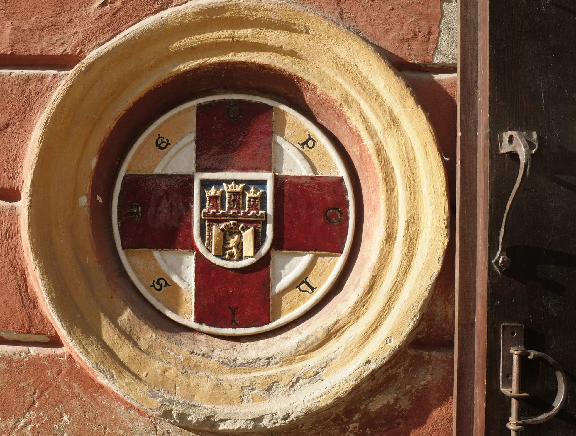 Lions holding the coat of arms guard the entrance to the Town Hall: