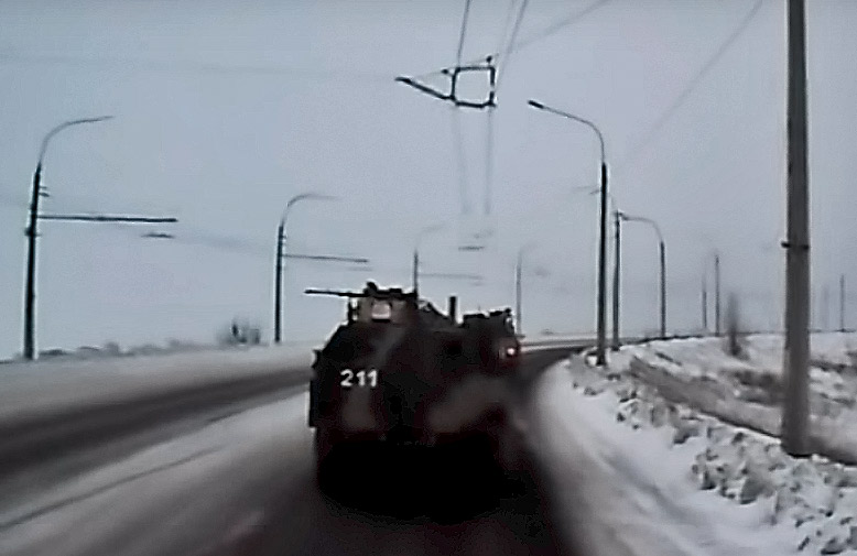 The clip features the BPM-97 Vystrel #221 moving in front of the truck of the cameraman, as geolocated by Euromaidan Press, from Molodohvardiysk towards Sorokyne approaching an overpass over the railway to enter the city from the north. Another Vystrel goes first in the convoy. The trolleybus overhead wires are distinct over both lanes of the highway. The place is pretty easy to be geolocated because Sorokyne trolleybus route #1 was the only intercity trolleybus in Luhansk Oblast.