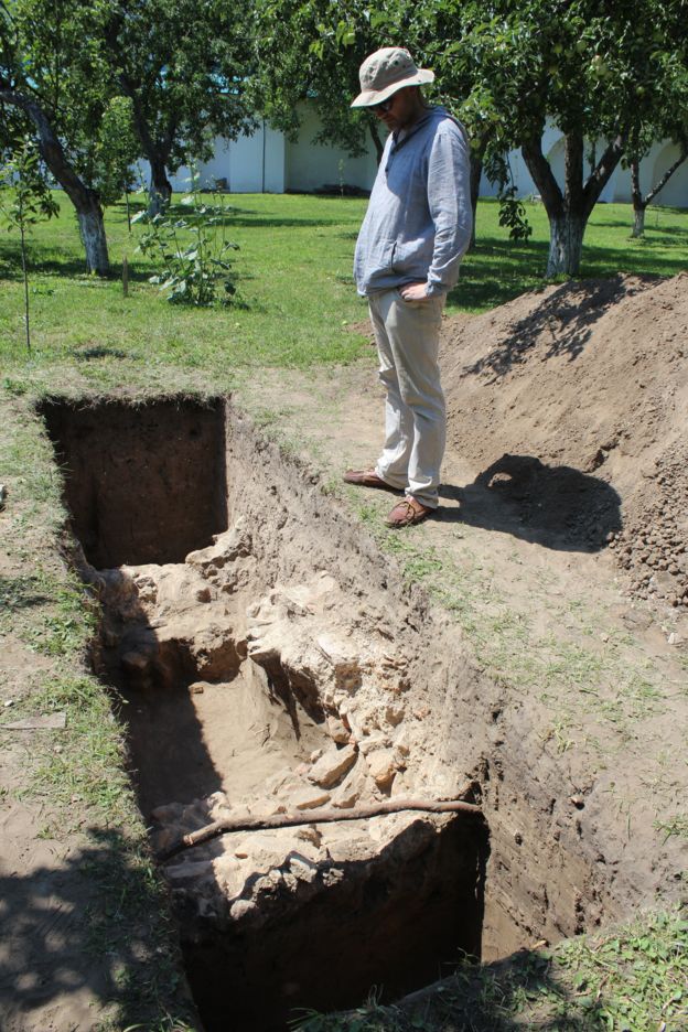 The dig was conducted near the Gate Church of the Trinity in the Metropolitan Garden of the Lavra.