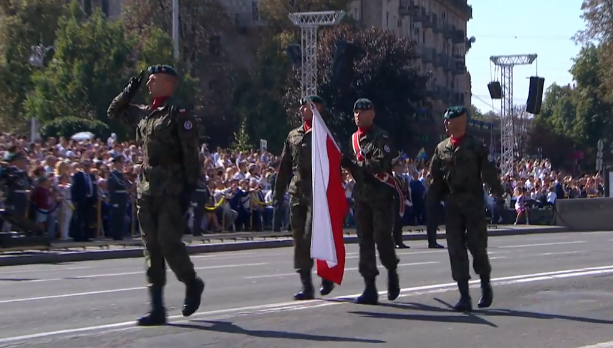 As well, 18 foreign delegations took part in the parade. Particularly, parade units from the United Kingdom, USA, Canada, Lithuania, Estonia, Poland, Romania, Moldova, as well as flag holders from Georgia, Latvia, Denmark, the Czech Republic, and the multi-national LitPolUkr brigade, marched down Kyiv's central avenue (photos are screenshots from broadcast of parade unless noted otherwise).