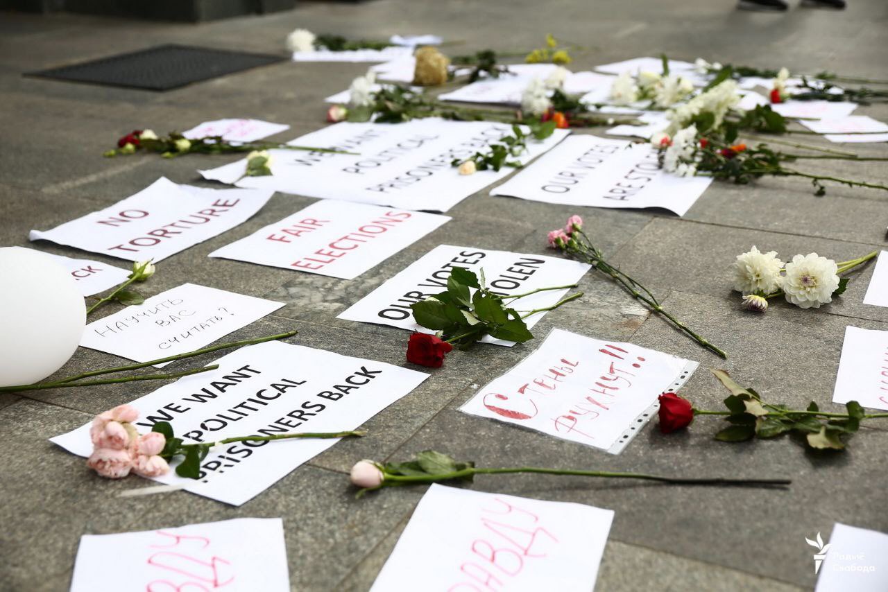 Women brought posters that say: “We want political prisoners back”, “Stop tortures” and “Fair elections.”