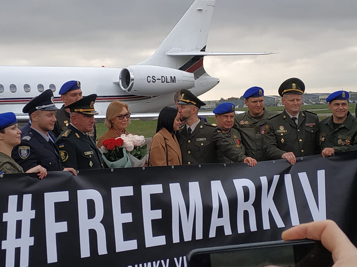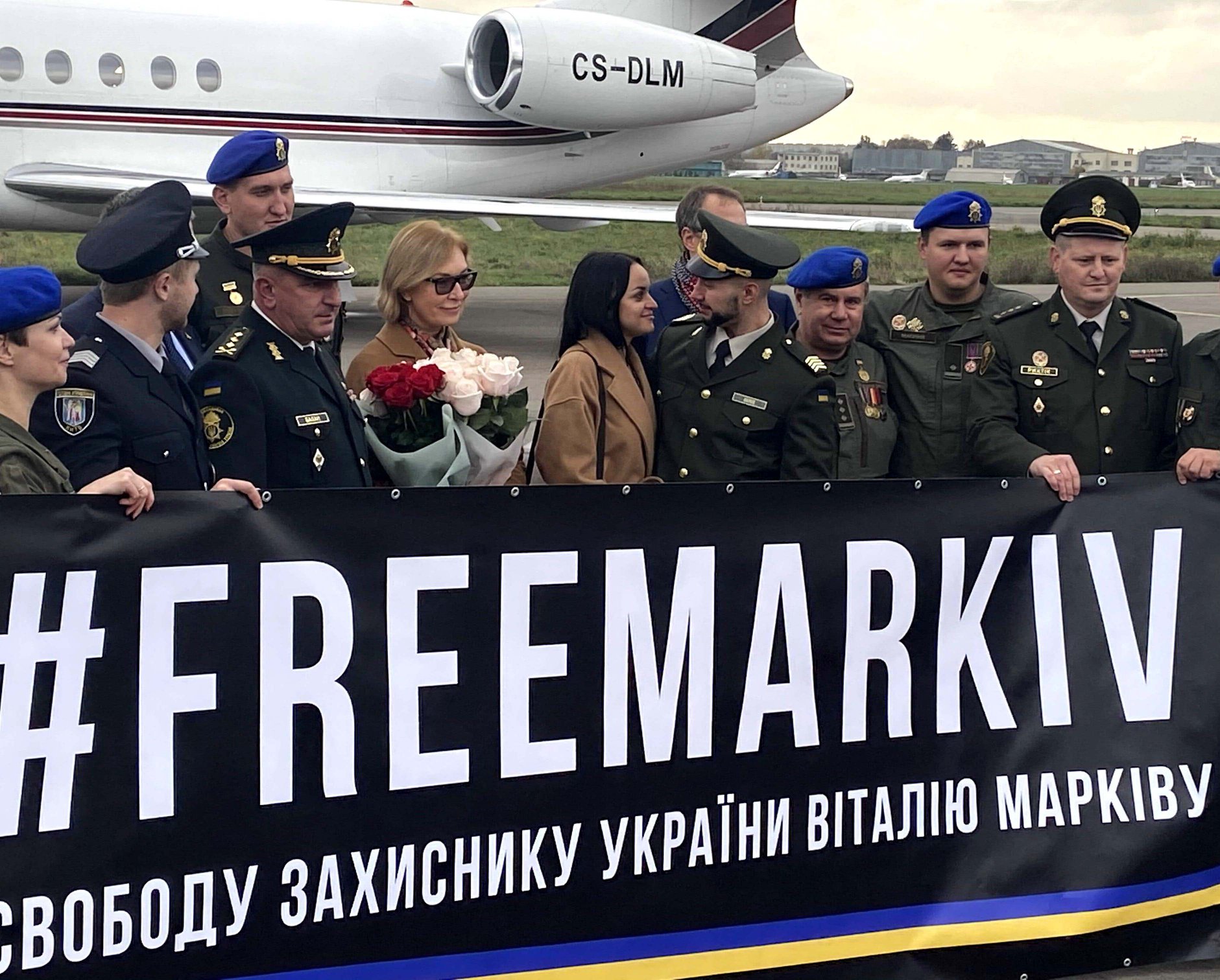 When the Ukrainian aircraft landed in Kyiv, Vitaliy Markiv was the first to disembark, wearing the uniform of the National Guard of Ukraine and holding a blue-and-yellow flag in his hands. He was welcomed by his wife Diana, friends, Ukrainian officials and his comrades-in-arms from the Kulchytsky Battalion. Markiv gave a brief speech and answered some questions before being whisked away to meet President Zelenskyy.