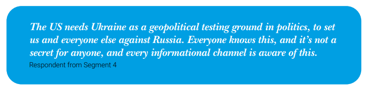 "The aim of these narratives [is] to not so much make Russia look great but sort of equalize the West and Russia, undermine reforms [in Ukraine], undermine trust," noted Peter Pomerantsev.Ukraine's south and east, supporters of a pro-Russian party are more susceptible In the run-up to the October 2020 local elections, the Center for Security Studies (CSS) at ETH Zurich conducted polling among different demographics in Ukraine in order to explore the traction of anti-West conspiratorial narratives. The data of the survey showed that half of the supporters of the pro-Russian parties in Ukraine, Opposition Platform - For Life and Party of Shariy, are likely to believe anti-Western conspiracies. Regionally, about half of the Ukrainians in the country's south and east believe or tend to believe that Western curators control Ukraine and that Soros with IMF want to exploit the Ukrainian lands, which is some 20% higher than in Ukraine's west and center, where around 30% have the trust of various degree in these narratives.