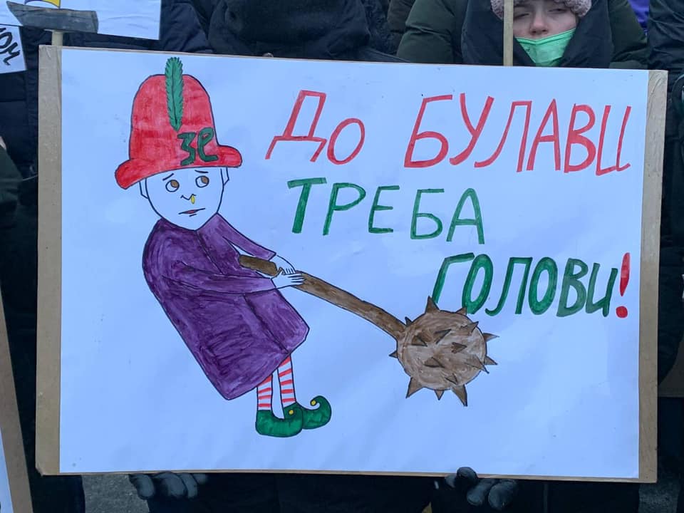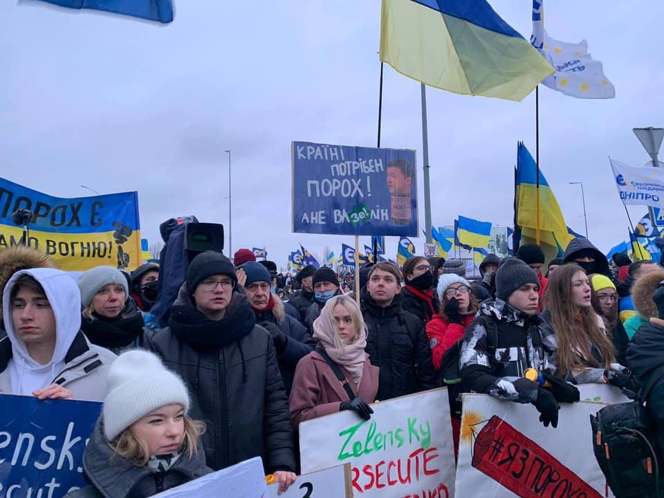 They chanted "Poroshenko," "Protect democratic future of Ukraine," "We need democracy," as well as held portraits of Zelenskyy with the inscription "dictator."