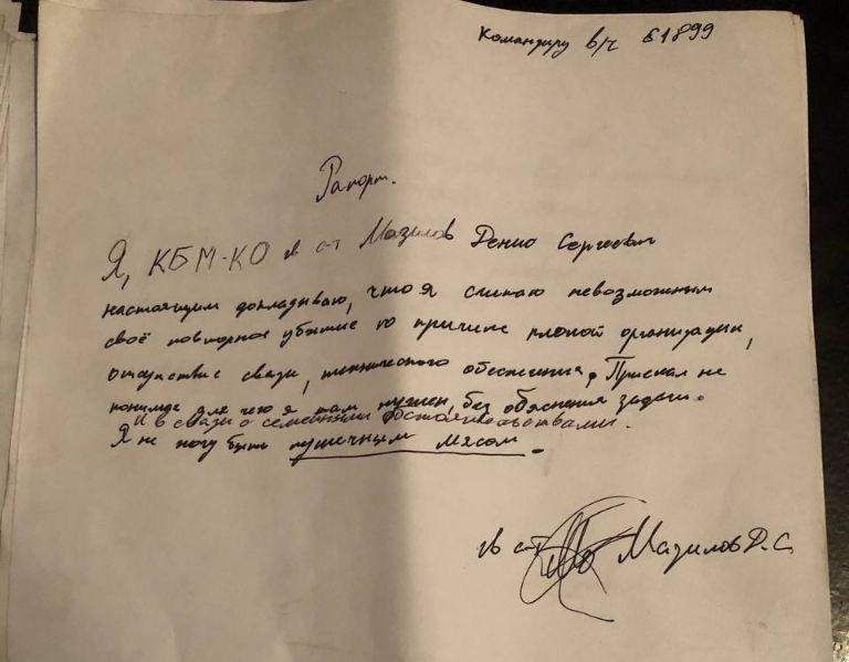 Sergeant Sapar M. Mirapov wrote in his personal statement to the commander of the Military Unit #61899:
