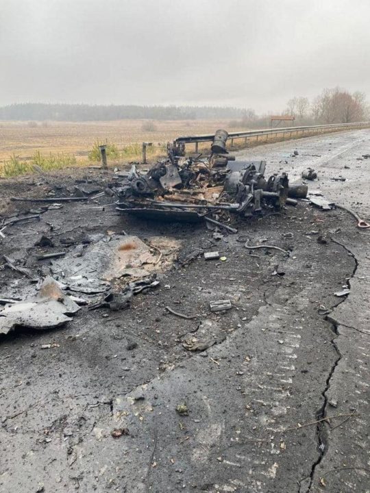 A destroyed Russian tank on the middle of the road to Bohdanivka. Credit: General Staff of Armed Forces