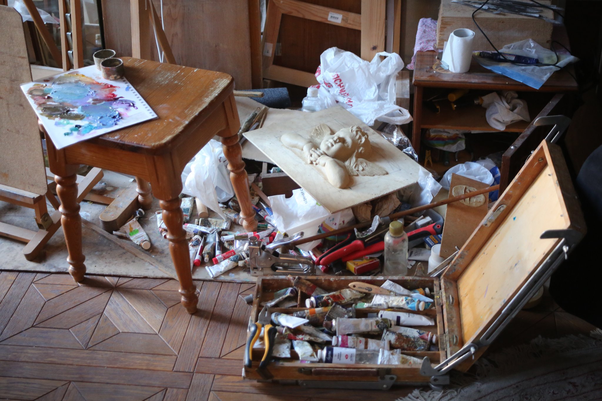 Taras enlisted in the Territorial Defense Force on February 28, 2022. When Kyiv was bombarded by missiles in the early days of the war, Taras moved his family to Boyarka, a suburb of Kyiv, to collect all paintings, banduras and other musical instruments, sculptures, and the entire library and transport them to Polonne in Khmelnytsk Oblast in western Ukraine.