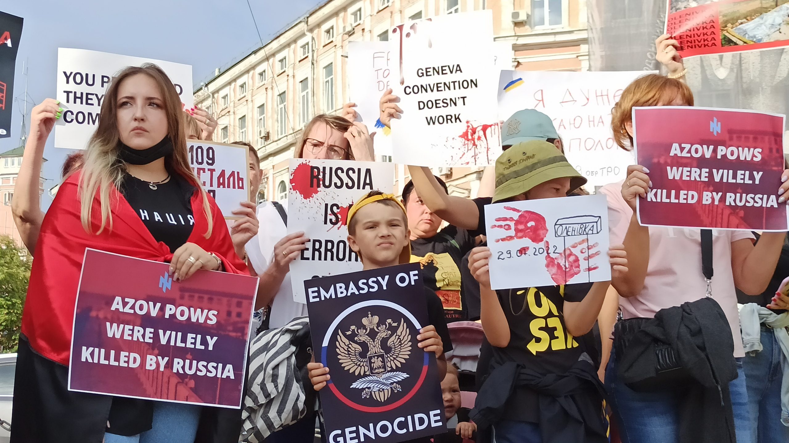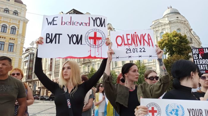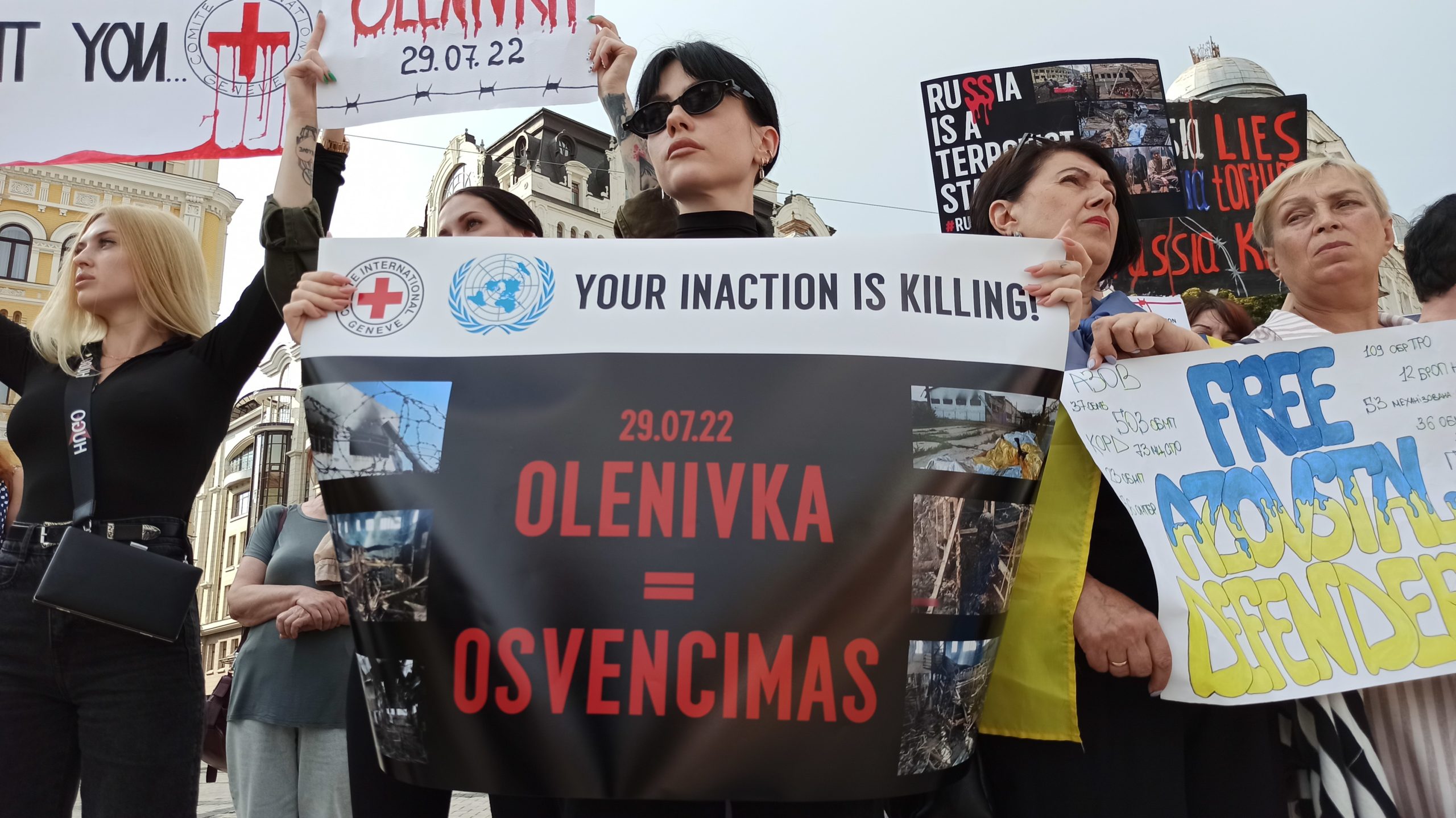 ![A woman with a sign saying "Olenivka = Osvencimas [Auschwitz]" during a protest about Ukrainian POWs killed Russian colony.](https://euromaidanpress.com/wp-content/uploads/2022/08/Azovstla6-1-scaled.jpg)