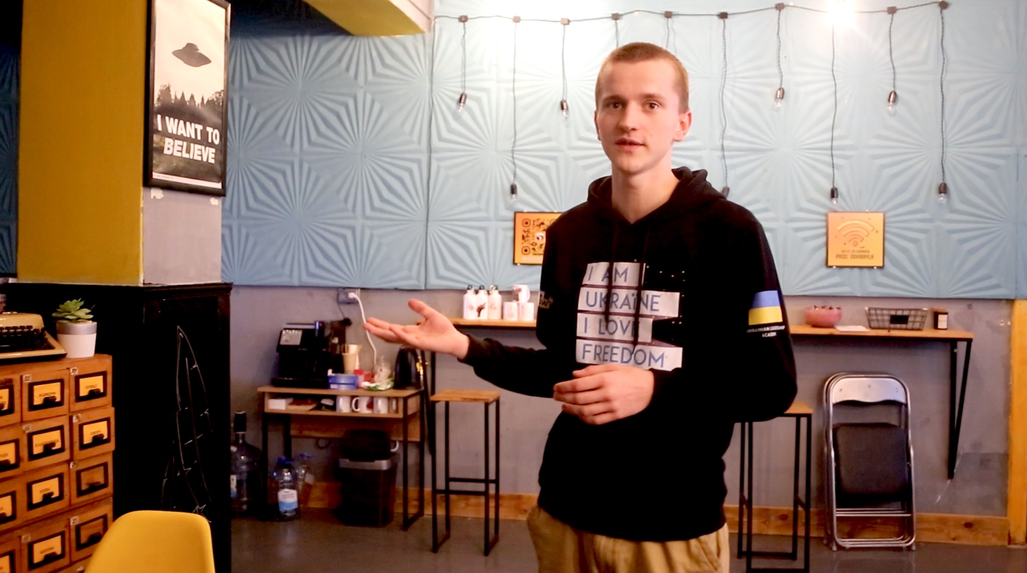 Here, amid wall-mounted posters about Ukrainian culture, we met with one of the center’s members, 18-year-old Mykhaylo.