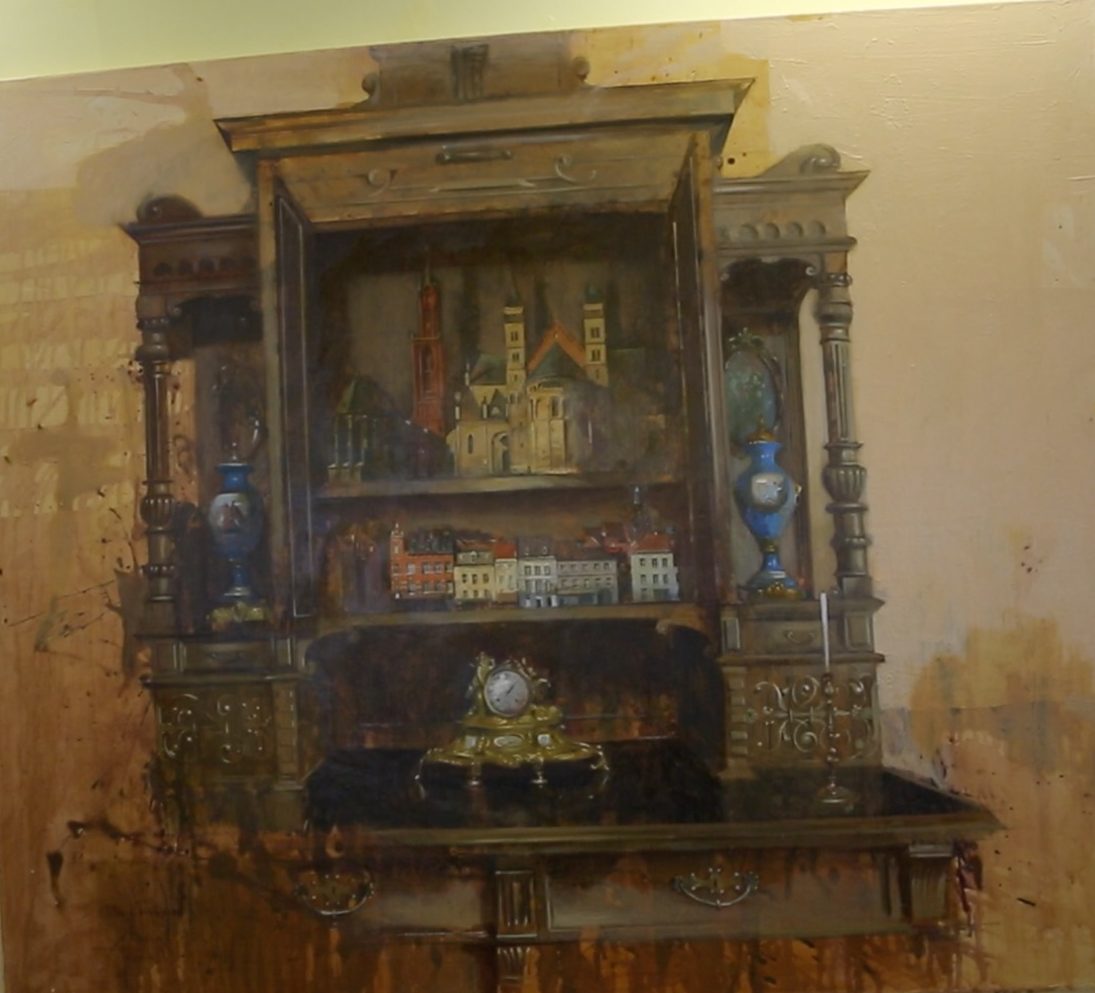 One of Artem’s paintings features Kharkiv in one eye and Novovolynsk in the other; these are his daughter's eyes. On the other, a wooden locker contains his memories of home. Many of his works have already been sold.