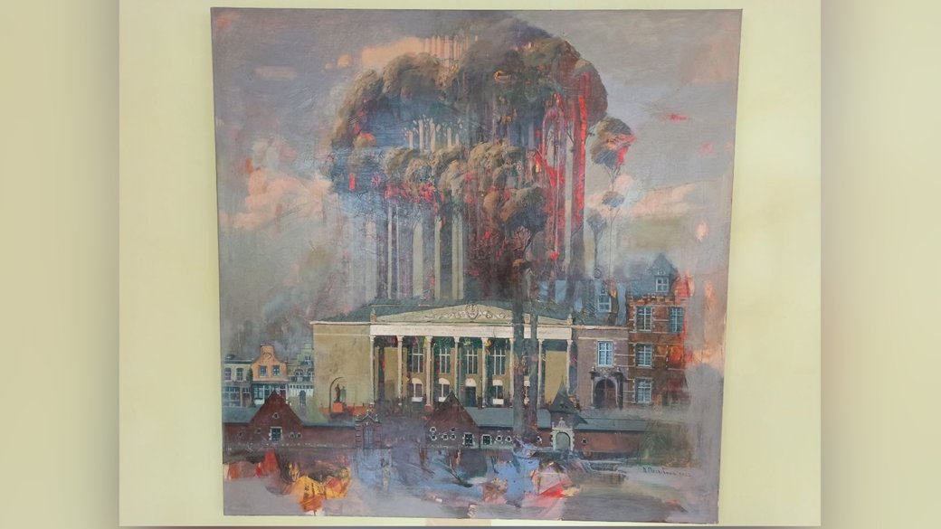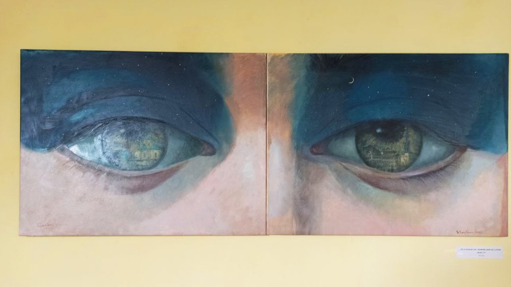 The latest paintings by Kharkiv artist and restorer Artem Pohribnyi are on display on the museum’s second floor. Pohribnyi was forced to leave his hometown, which is located just 30 kilometers from Russia. In his paintings, “he tries to convey how much he misses his hometown,” Iryna observes.