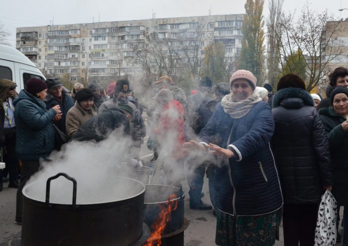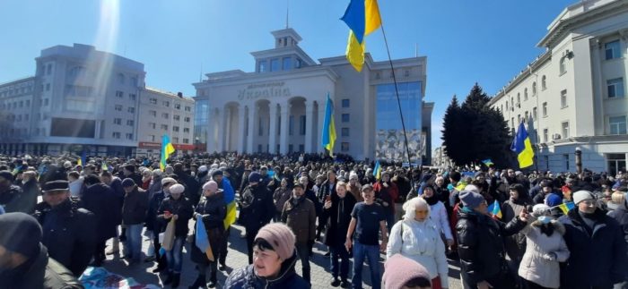 Residents of occupied Ukrainian towns engage in peaceful mass protests against Russian invaders. Ukrainians throughout the country in great numbers join grassroots volunteering initiatives to support the army with equipment, vehicles, uniforms, and food; polls show that 80% of Ukrainians participate in the defense of Ukraine in some way.