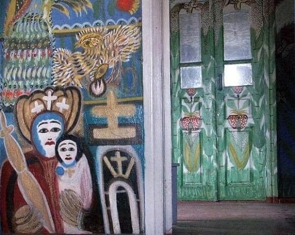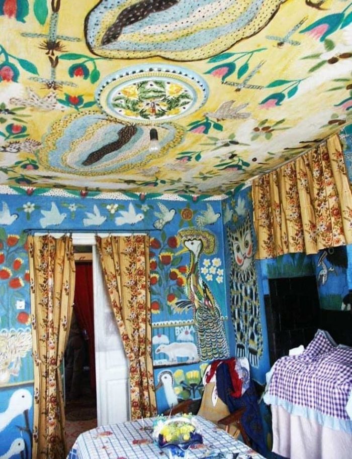 With her meager pension, she began buying paints and brushes and, without any formal training or prior experience, transformed her humble abode into an expansive canvas, adorning its walls and even the ceiling, room by room. She chose to leave the exterior mostly untouched, only adding small fragments of her artwork, possibly due to her shy nature and innate unwillingness to open her doors to strangers.