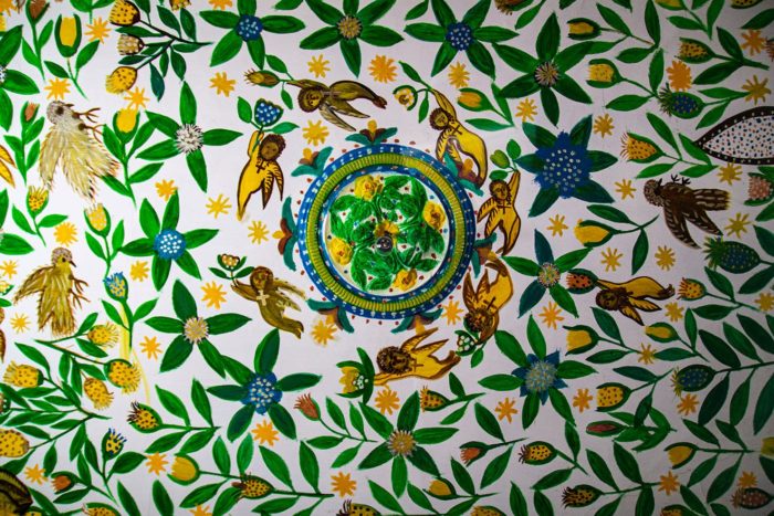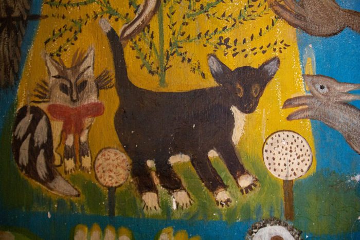 “Having never received formal training in painting, Polina Raiko developed her own unique ‘iconography’. The placement of specific subjects within the house was directly linked to the corresponding rooms. For instance, a painting portraying her wedding can be viewed from the bedroom door, while leopard birds, guardians and protectors adorn the entrance to the bedroom. A small black dog is depicted near the stove, and a vulture symbolizing war is positioned above the hearth. Almost every composition within the rooms features a protective talisman in the form of paired storks, swans or doves.”