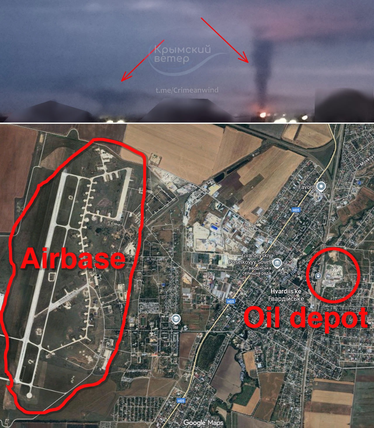 Krymsky Veter later stated, citing messages from its subscribers in Crimea and the available footage, that the second plume of smoke visible near Hvardiiske likely came from an additional strike close to the airbase and Russian garrison west of the settlement. The channel published footage and maps showing the proximity of the burning ATAN depot and the Hvardiiske airfield.
