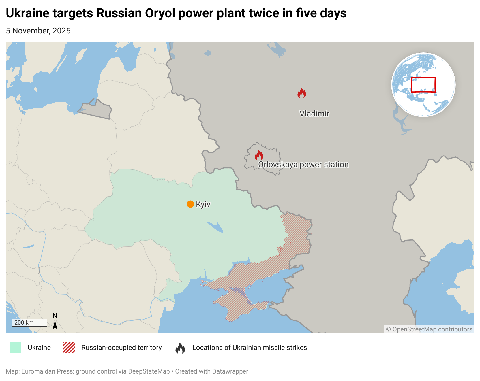 The Oryol thermal power plant was previously attacked on the night of 31 October. According to the Ukrainian Navy, the facility was struck with Neptune cruise missiles at that time. The strike hit an open switchgear facility, causing massive power outages in the city.