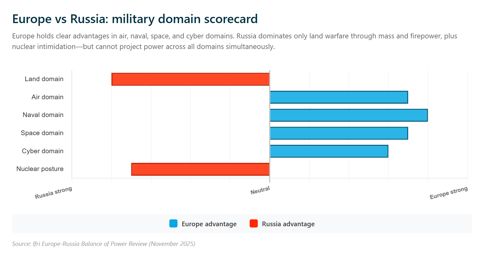 The IFRI assessment notes that while Russia retains war-fighting capacity, Europe holds clear advantages in air, naval, space, and cyber domains. Russia dominates only land warfare through mass and firepower, plus nuclear intimidation, but cannot project power across all domains at once. Outside Ukraine’s ground war, the military balance remains decisively in Europe’s favor.