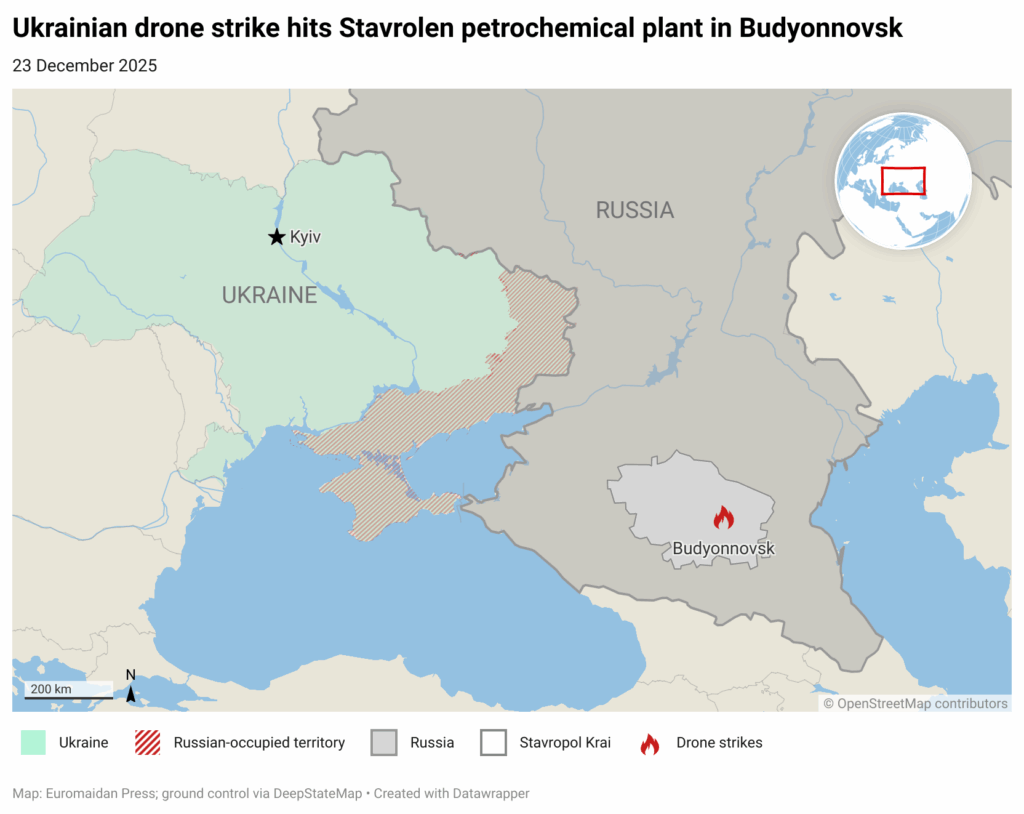 Ukrainian drones struck the Stavrolen petrochemical plant in Budyonnovsk, Russia, overnight on December 23, sparking a large fire, according to videos shared by the Telegram channel Exilenova+.