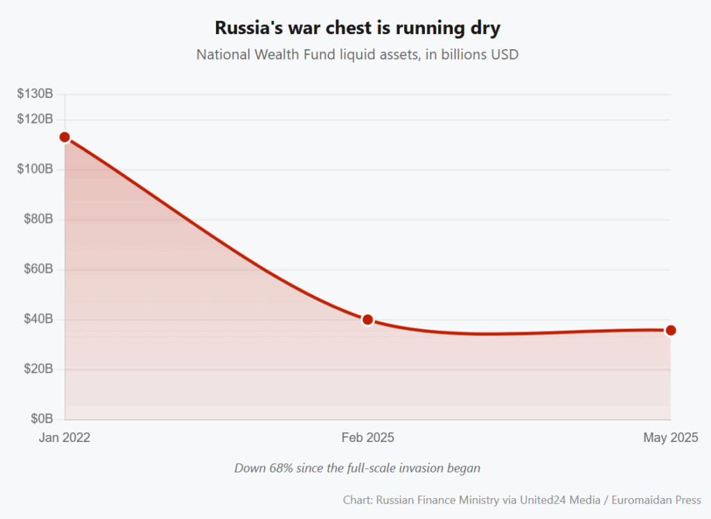 The liquid assets of the National Wealth Fund, Russia’s emergency reserve, have shrunk from $185 billion in 2021 to $35.7 billion.