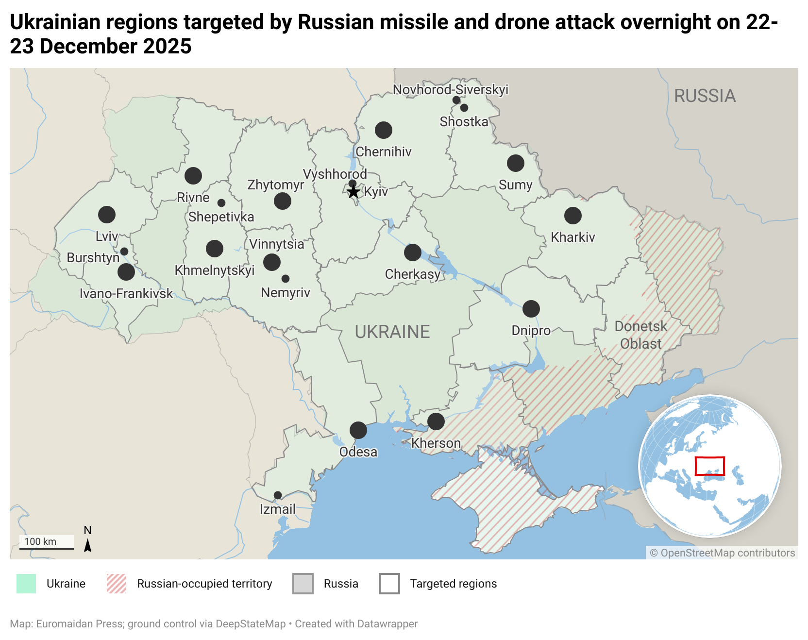 Russia launched a massive combined missile and drone attack on Ukraine's power grid overnight on 22-23 December, killing at least three civilians, including a 4-year-old child. The Christmas-week assault injured at least 13 people across multiple oblasts and triggered emergency blackouts nationwide, according to local authorities and the power grid operator. At the time of publication, the attack continues, with several explosive drones still reportedly in the air. More civilians were hurt in other Russian attack, such as FPV-drone strikes and artillery shelling.