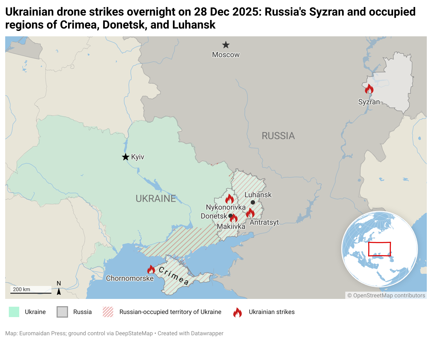 Last night, Ukrainian drones struck Russia’s Syzran oil refinery in Samara Oblast about 800 km from the frontline, causing a fire and targeting the refinery’s only crude oil processing unit, according to independent reports and the General Staff of the Armed Forces of Ukraine. The same night, Ukraine’s Defense Forces also hit Russian military infrastructure in occupied Crimea, Luhansk, and Donetsk oblasts, the General Staff reported.