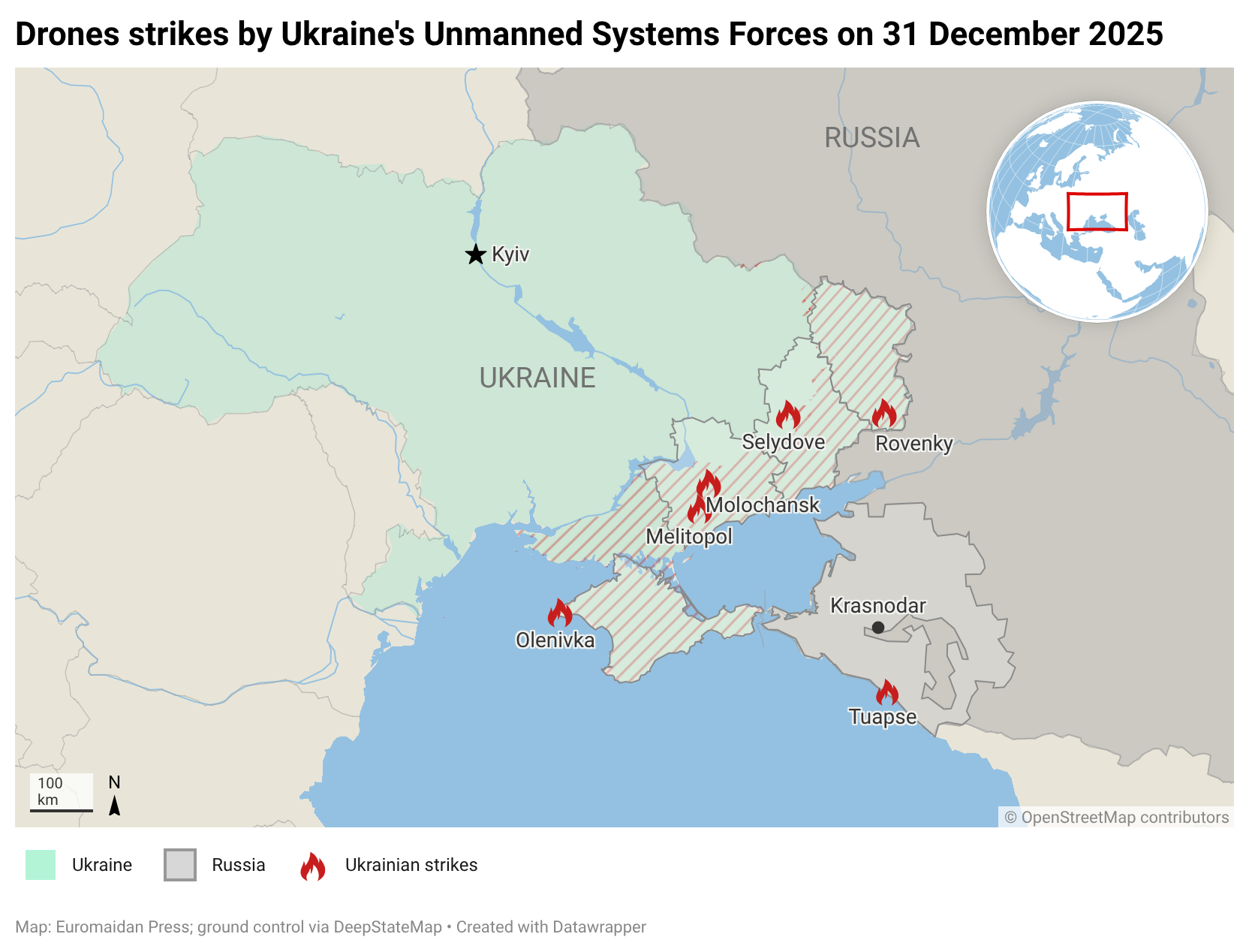 On 31 December, Brovdi reported that Ukrainian drones struck two targets in Russia and ten more in occupied Ukrainian territory. The latter included the following: