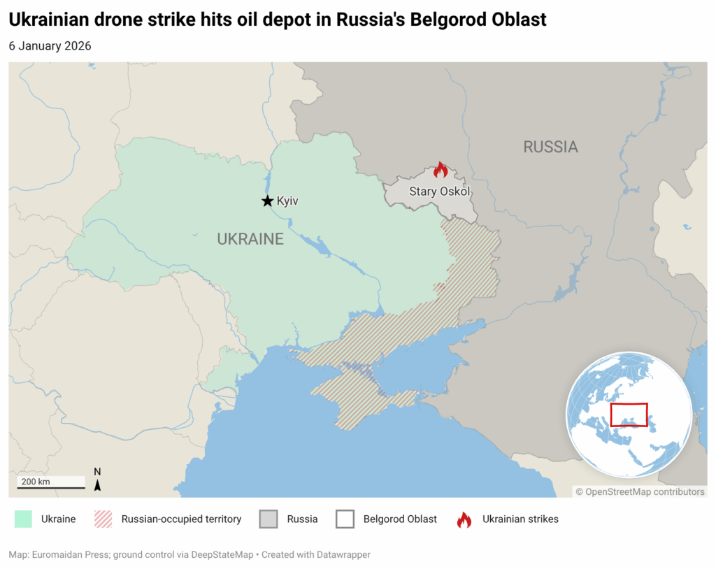 A drone struck an oil depot in Stary Oskol, Belgorod Oblast, Russia, on the evening of 6 January, causing several storage tanks to catch fire, regional governor Vyacheslav Gladkov said.