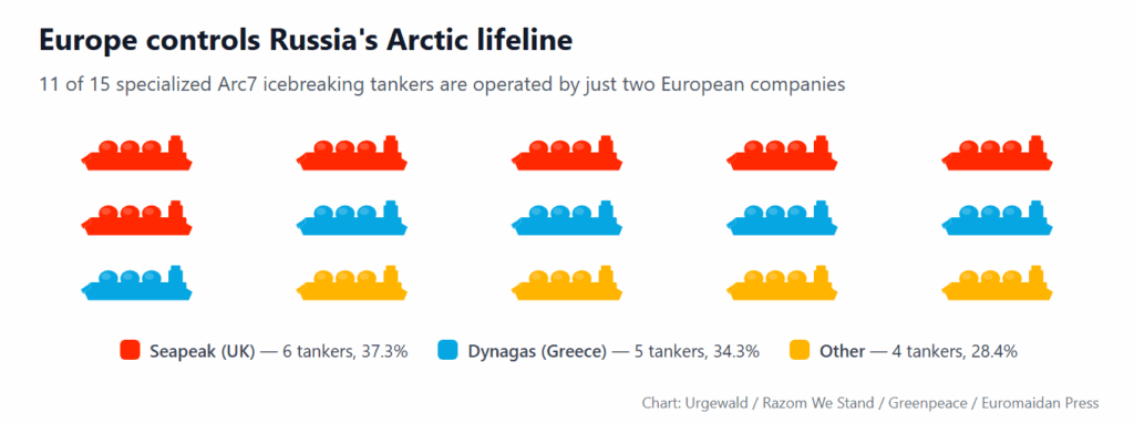 Russia’s Arctic LNG operations depend on 15 specialized Arc7 icebreaking tankers—the only vessels capable of navigating frozen Arctic waters year-round. Eleven of them are controlled by just two European companies: the UK-based Seapeak (six ships, accounting for 37.3% of 2025 shipments) and the Greek-owned Dynagas (five ships, accounting for 34.3%).