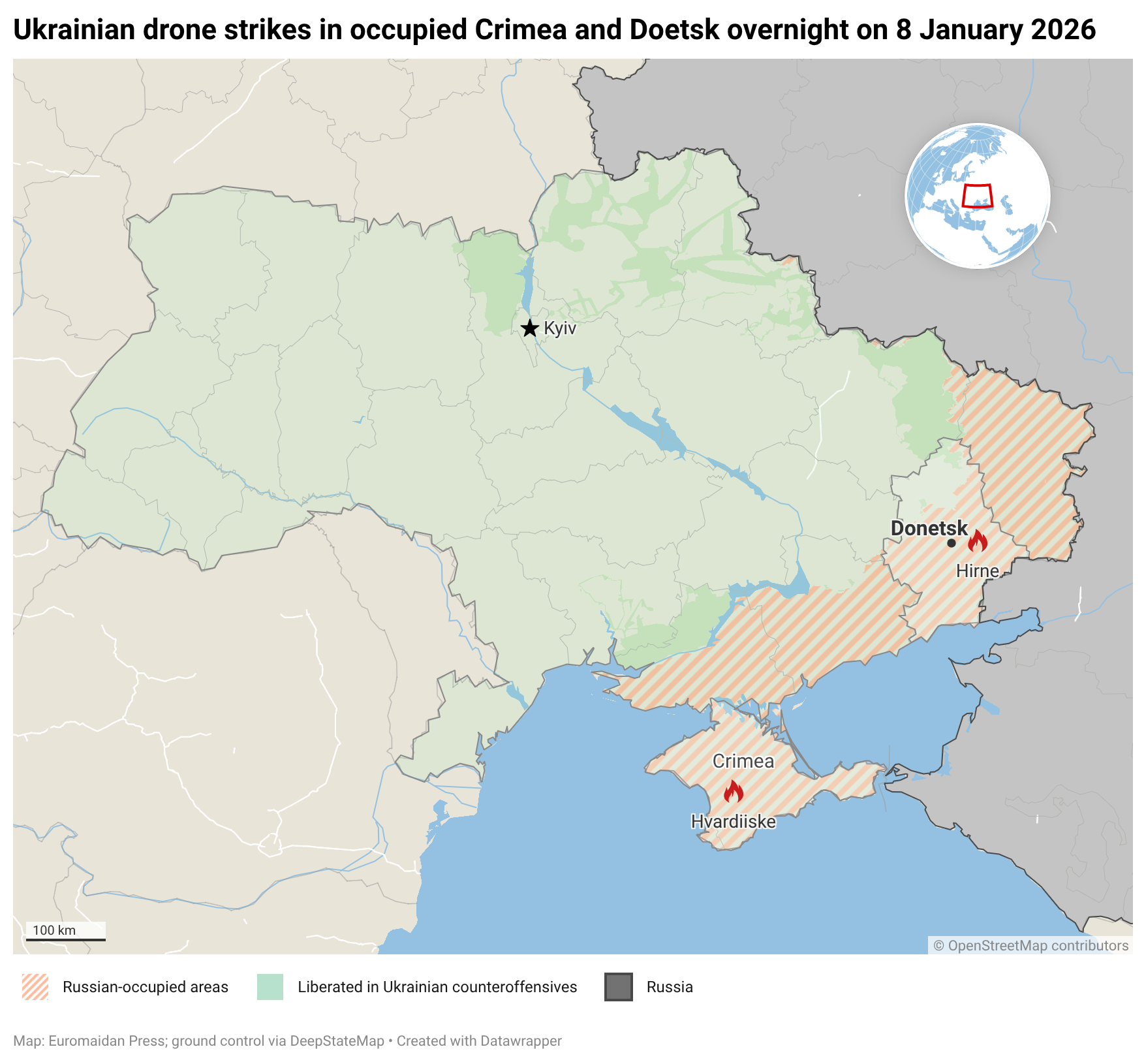 Ukrainian forces struck key Russian military logistics in occupied Crimea and Donetsk oblast overnight on 8 January using FP-2 mid-range strike drones, according to the General Staff of Ukraine and Special Operations Forces (SSO). The twin attacks targeted a fuel convoy at an oil base in Hvardiiske and an ammunition and matériel depot near Hirne.